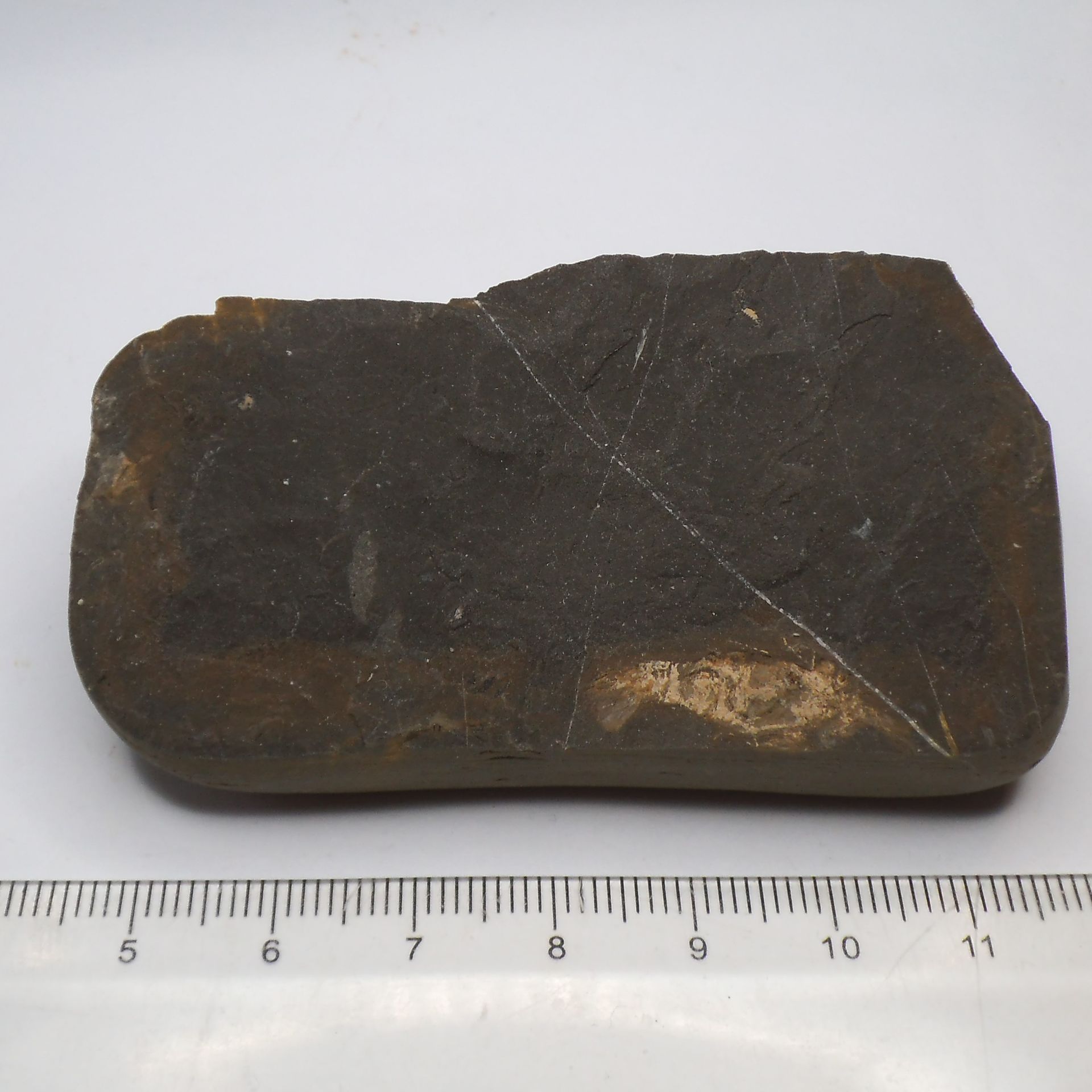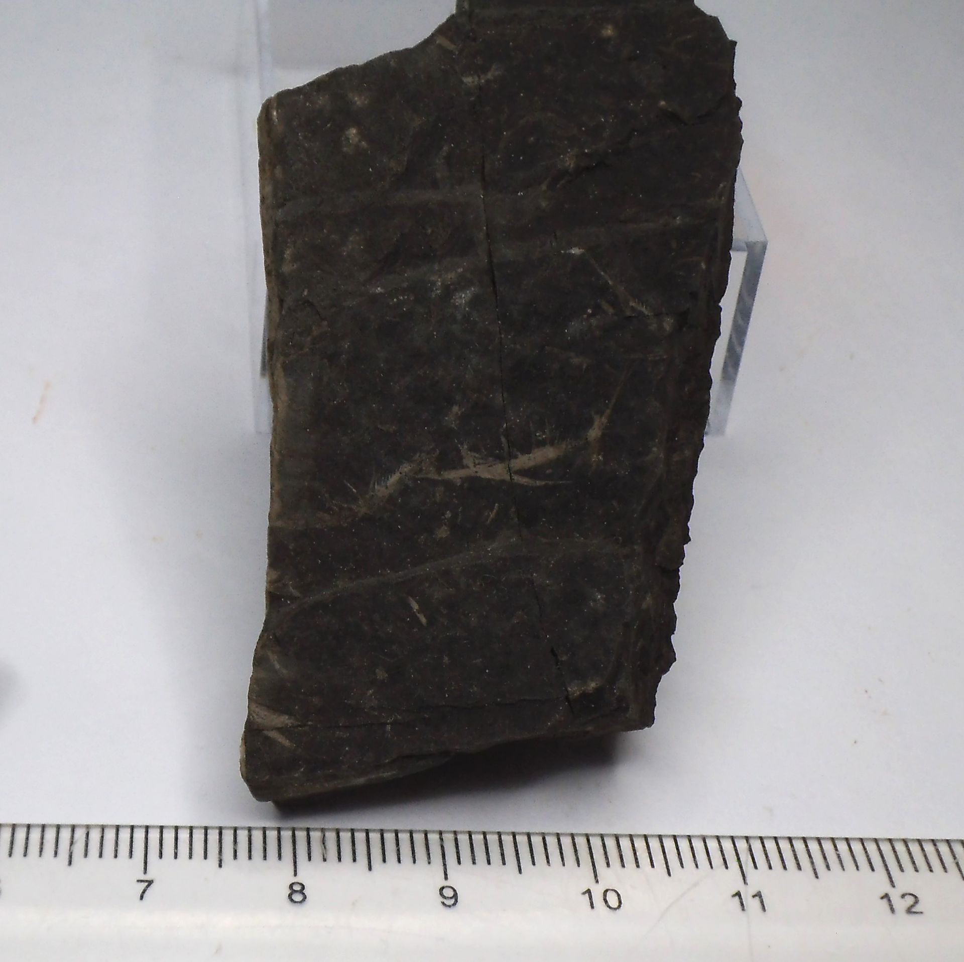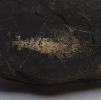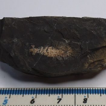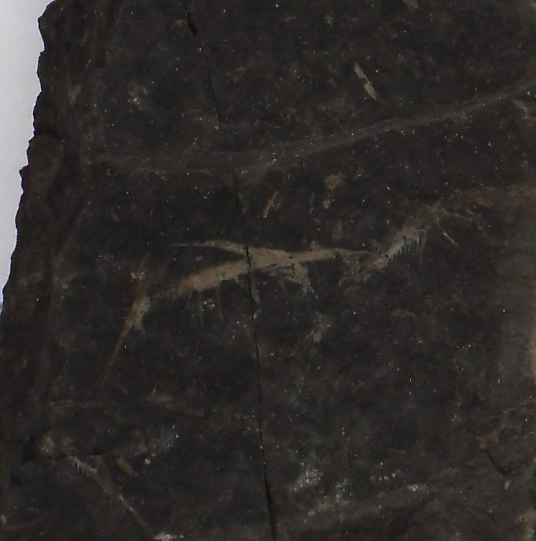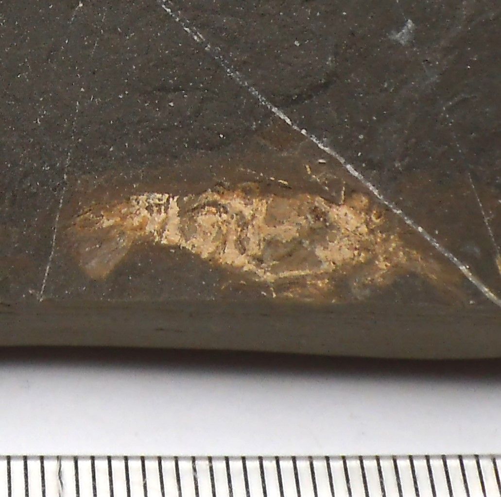 Tealliocaris woodwardi. A beautiful pod shrimp showing great body detail. Lower Oil Shale Group, Gullane Formation, Visean, Carboniferous circa 330 million years old. Cheese Bay, East Lothian, Scotland. It is 18 mm in length. Scale is shown in (cm). Supplied labeled. Priced at £29. CR 248.