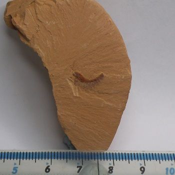 Tealliocaris woodwardi. A beautiful pod shrimp showing great body detail. Lower Oil Shale Group, Gullane Formation, Visean, Carboniferous circa 330 million years old. Cheese Bay, East Lothian, Scotland. It is 20 mm in length. Scale is shown in (cm). Supplied labeled. Priced at £29. CR 275.