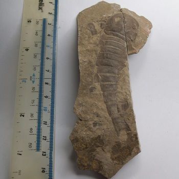 Eurypterus (Balteurypterus) tetragonophtalmus. An exquisite Eurypterid (sea scorpion) dating circa 427 million years old. Gorstian Stage, Ludlow Subdivision, Ustya Formation, Upper Silurian. Velykozalissya, Kamianets-Podilskyi Raion, Khmelnytskyi Oblast, Ukraine. Size: Body length is 90 mm or 3 1/2 inch. An excellent display/study fossil. Has been repaired. Supplied with label. SOLD. Priced at £139. CR 271.