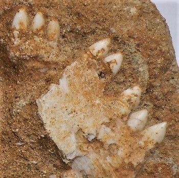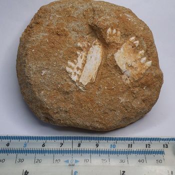 Sparus sp. An absolutely gorgeous jaw with many teeth on original matrix. The scale is shown in (cm) and inches. It comes from the Maastrichtian Stage Continental Sandstones, Cretaceous of Ouled Bou Ali, Morocco, Africa and dates circa 65 million years old. An excellent display piece. Priced at £39. Quote reference number FAF 1024.