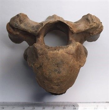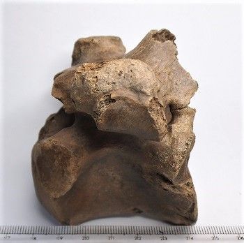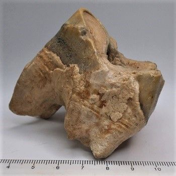 Bison sp. An english (land find not North Sea) bison vertebra. Has damage hence low price to clear. It is Devensian Stage, Pleistocene age circa 25-40 thousand years old and comes from Peterborough, Cambridgeshire, UK. It measures 80 mm or over 3 inches in height. Scale is shown in (cm). Supplied with label. Priced at just £14. SOLD. Quote reference number MEU 869.