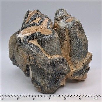 Stephanorhinus hemiotechus. A lovely molar tooth of an english Narrow-Nosed Rhinoceros. Exhibiting excellent enamel and measuring 58 x 42 x 58 mm. It is Ipswichian Stage, Pleistocene age circa 120 thousand years old and comes from Peterborough, Cambridgeshire, UK. These Interglacial fossils are extremely rare and only a small number of sites have been recorded since the 1950's. This has been treated with B 72 hardener. Scale is shown in (cm). A superb specimen for display/study. Supplied with label. Priced at just £349. MEU 887.
