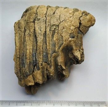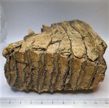 Mammuthus primigenius. An english (land find not North Sea) rare woolly mammoth frontal molar. Has damage hence low price to clear. It is Devensian Stage, Pleistocene age circa 25-40 thousand years old and comes from Peterborough, Cambridgeshire, UK. It measures 130 mm or 5 inches in height. Scale is shown in (cm). Supplied with label. Full providence as found by me on 23rd June 2013. Priced at just £169. Quote reference number MEU 897.