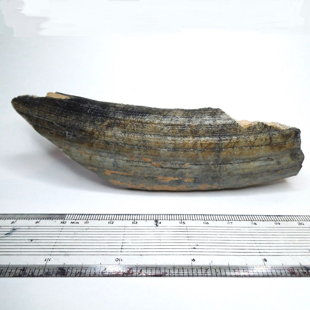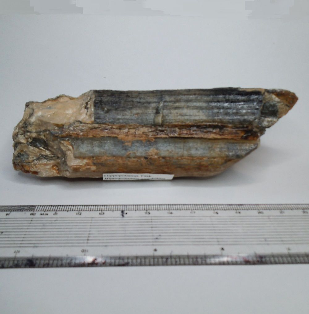 Hippopotamus amphibius. A lovely lower left canine tusk of an english adult hippopotamus. Exhibiting excellent enamel and measuring 145 mm or almost 6 inches in length. It is Ipswichian Stage, Pleistocene age circa 120 thousand years old and comes from Peterborough, Cambridgeshire, UK. These Interglacial fossils are extremely rare and only a small number of sites have been recorded since the 1950's. This has been repaired and treated with B 72 hardener. Scale is shown in (cm). A superb specimen for display/study. Supplied with label. My very last one, priced at just £499. Quote reference number MEU 911.