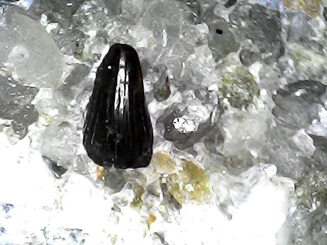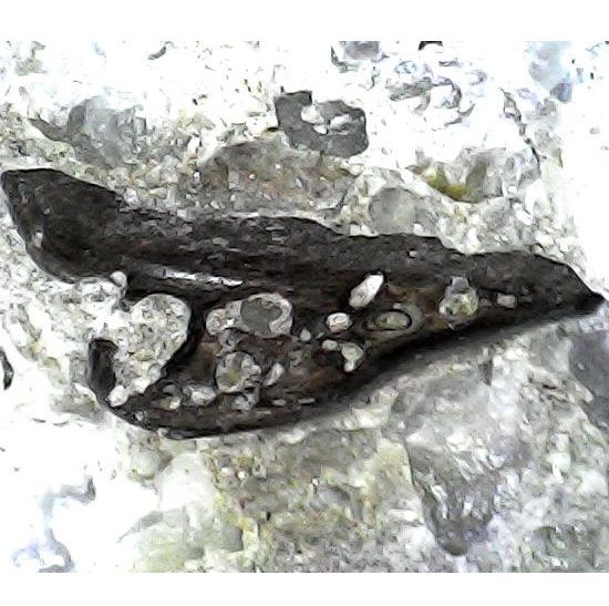 Goniopholididae gen. indet.? This rare posterior pholidosaurid tooth has superb detail with shiney enamel. It measures 4.5 mm in height. A few bits of turtle shell can be seen also. It is Lower Cretaceous age circa 138 million years old and comes from the Hastings Beds, of Hastings, East Sussex, UK. Supplied labelled. Priced at £29. Quote reference number R 908.