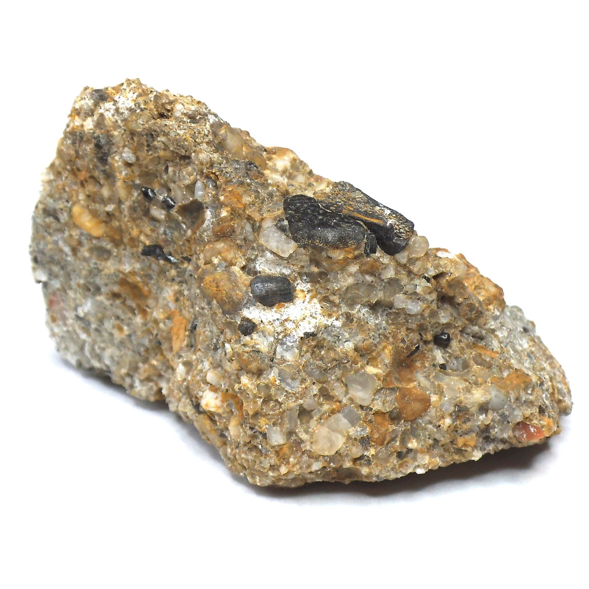 Pachystropheus rhaeticus. This lovely Triassic age reptile humerus is a good specimen measuring 45 mm in length. Several other vertebrate fossils litter this piece of bone bed. The matrix block has been repaired. It is Late Triassic age circa 210 million years old and comes from the Westbury Formation, Penarth Group of Blue Anchor, Somerset, UK. Supplied labelled. Priced at £49. Quote reference number R 633.