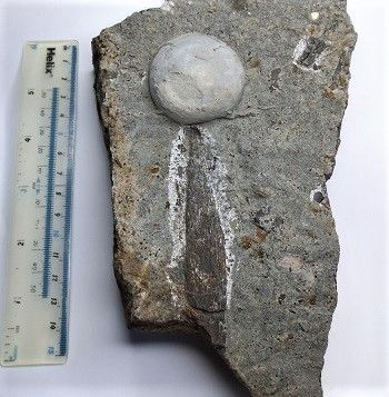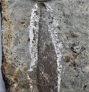 Nemacanthus monilifer. This uncommon near complete hybodont shark dorsal spine is a fair specimen despite the proximal end missing. Also seen is a Pachystropheus reptile vertebra in the top right corner. This specimen is 86 mm or 3 1/2 inches in height which is typical for an adult! It has good detail and is well presented on original matrix. Has had repair to a single break as seen. Has full providence. The scale is shown in (cm). It is Late Triassic age circa 210 million years old and comes from the Westbury Formation, Penarth Group of Somerset, UK. Supplied labelled. Priced at £59. Quote reference number SUKM 4204.