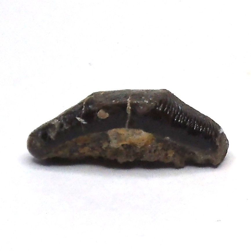 Synechodus sp. It measures 1.5 mm in height. It is Upper Jurassic age circa 153 million years old and comes from the Hartwell Clay, Upper Kimmeridgian Stage of Oday Hill, Abingdon, Oxfordshire, UK. Supplied labelled. Priced at £16. Quote reference number SUKM 4357.