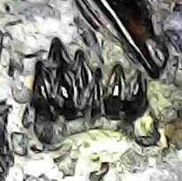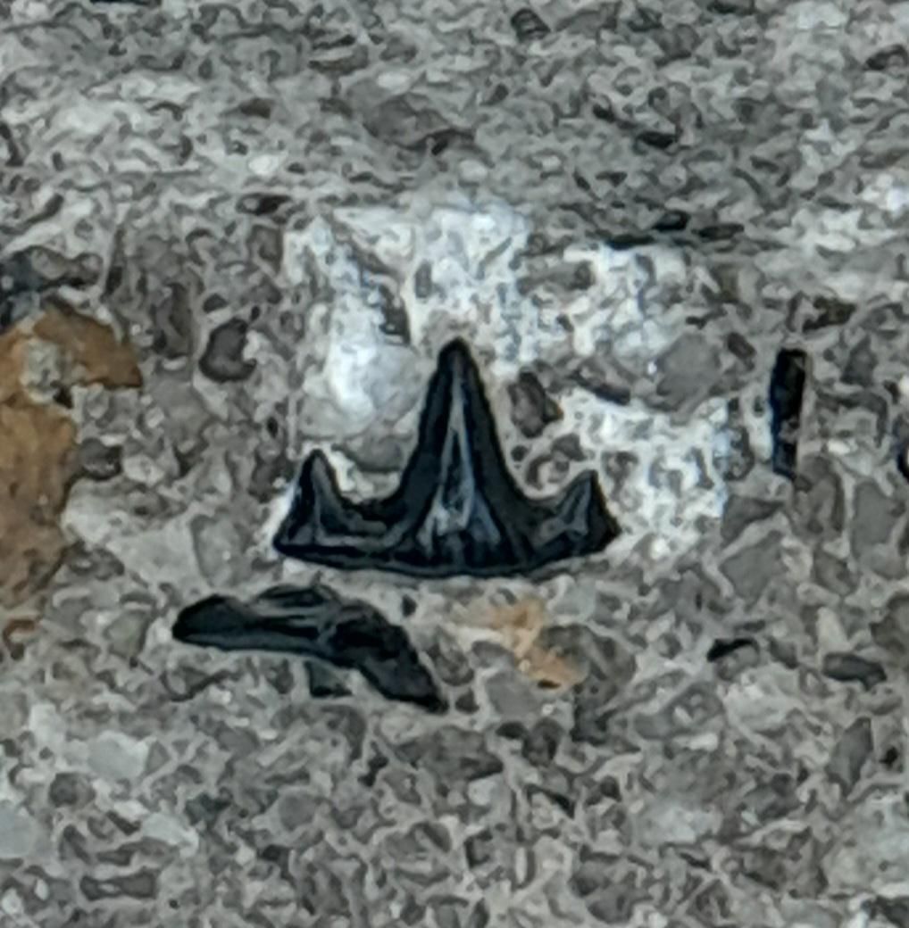 Pseudocetorhinus pickfordi gill raker tooth & Ctenacanthid shark scales. These are 3 mm and 1 mm in length respectively. Well presented on original matrix with many micro vertebrate fossils present. Picture of the scale is typical of what is present. It is Late Triassic age circa 210 million years old and comes from the Rhaetic Bone Bed, Westbury Formation, Penarth Group of Garden Cliff, Gloucestershire, UK. Supplied labelled. Priced at £24. Quote reference number SUKM 4622.
