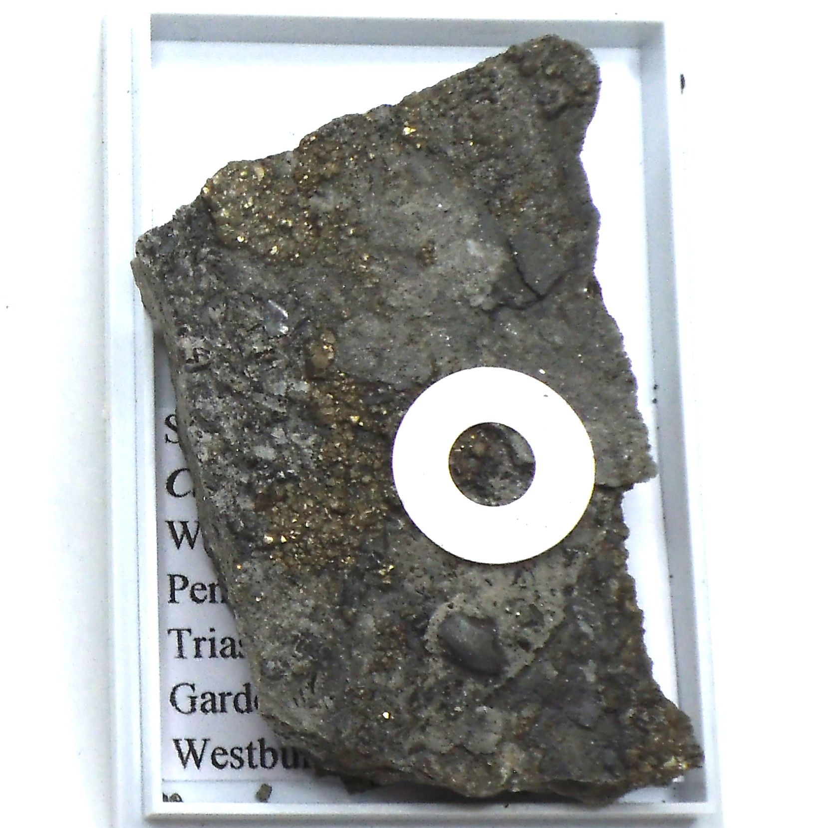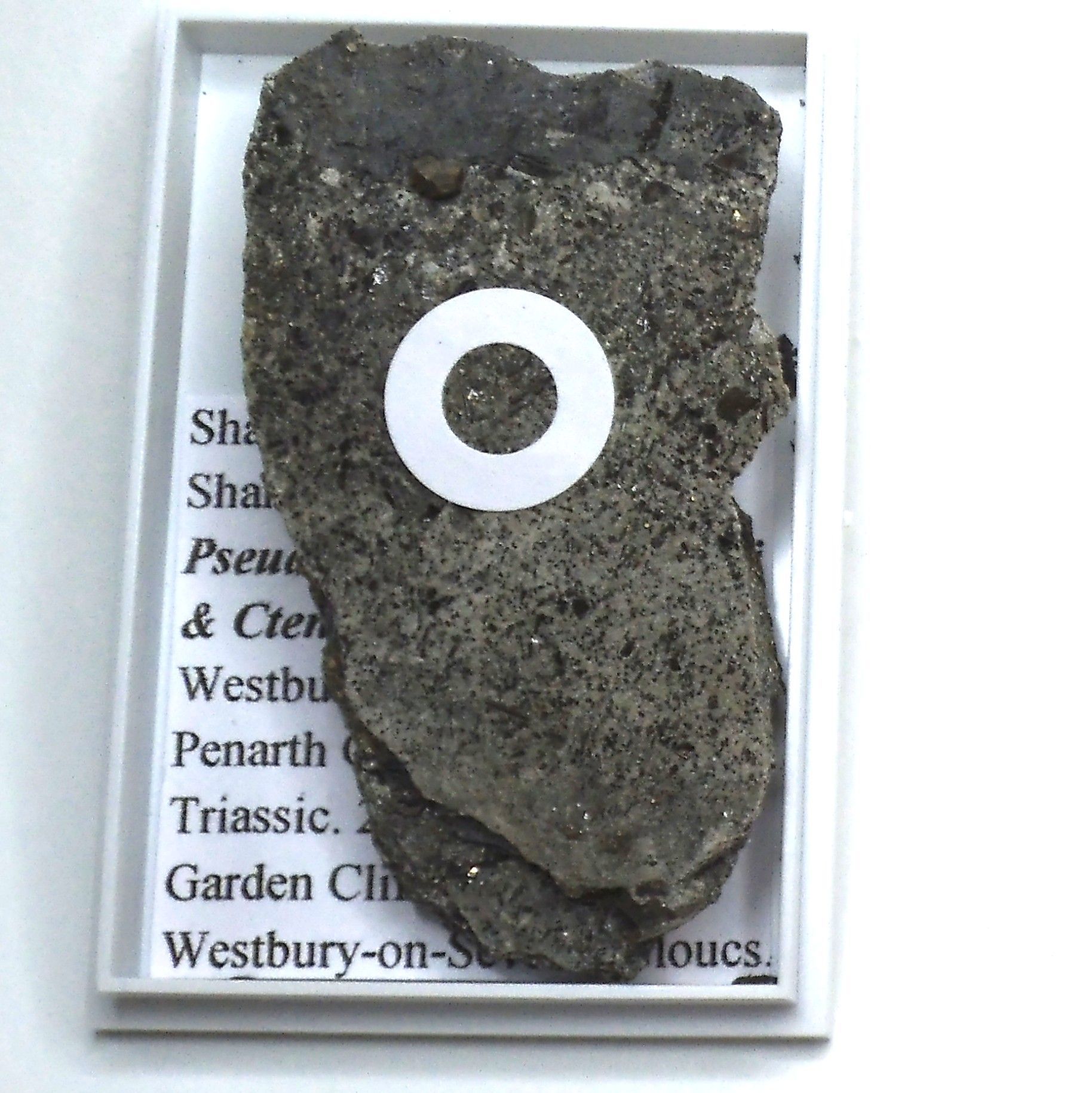 Protospinax planus. It measures 1 mm across. It is Upper Jurassic age circa 153 million years old and comes from the Kimmeridge Clay, Kimmeridgian Stage of Smallmouth, Weymouth, Dorset, UK. Supplied labelled and in an attractive display box. Priced at £5. Quote reference number SUKM 4415.