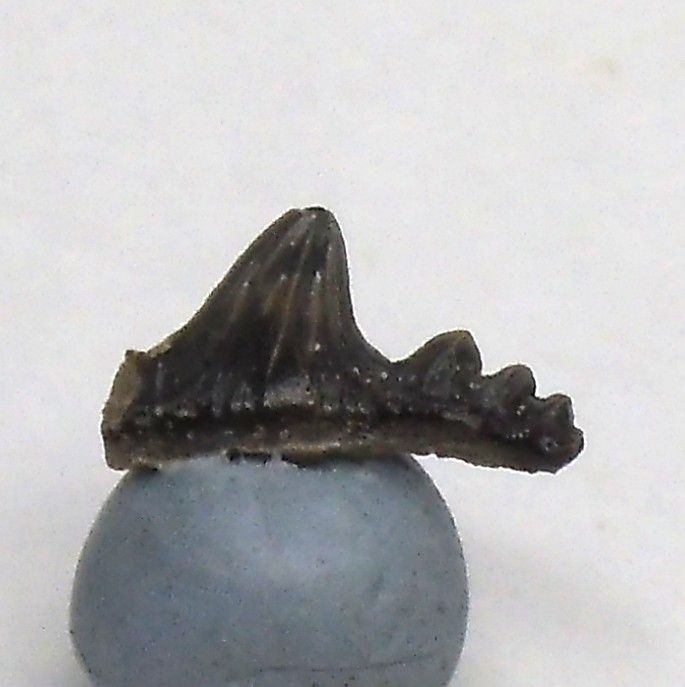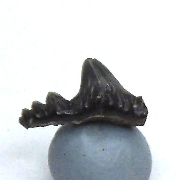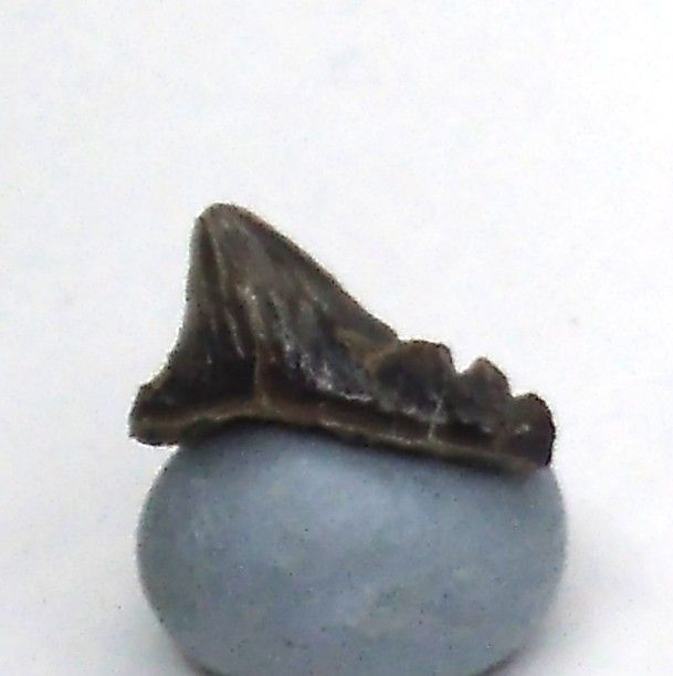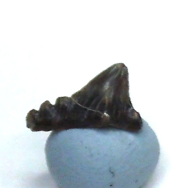 Egertonodus basanus. This gorgeous 6 mm in height hybodont shark tooth is a great specimen with lovely colouration. It is Lower Cretaceous age circa 138 million years old and comes from the Valanginian Stage of Hastings, East Sussex, UK. Supplied labelled. Priced at £16. Quote reference number SUKM 4625.