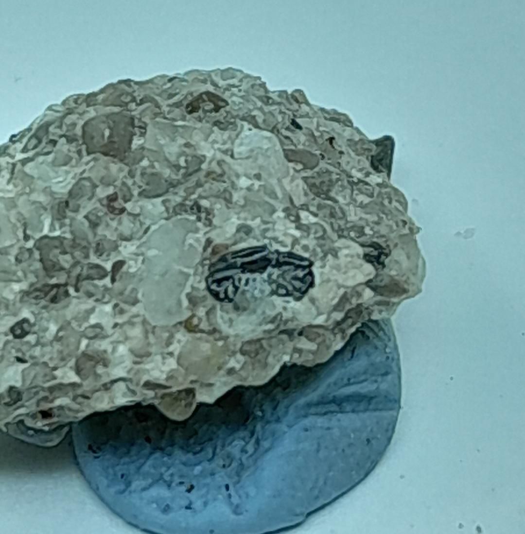Protospinax planus. It measures 1.5 mm across. It is Upper Jurassic age circa 153 million years old and comes from the Kimmeridge Clay, Kimmeridgian Stage of Smallmouth, Weymouth, Dorset, UK. Supplied labelled. Priced at £10. Quote reference number SUKM 4414.