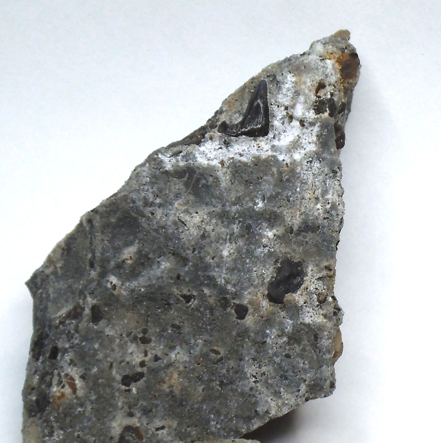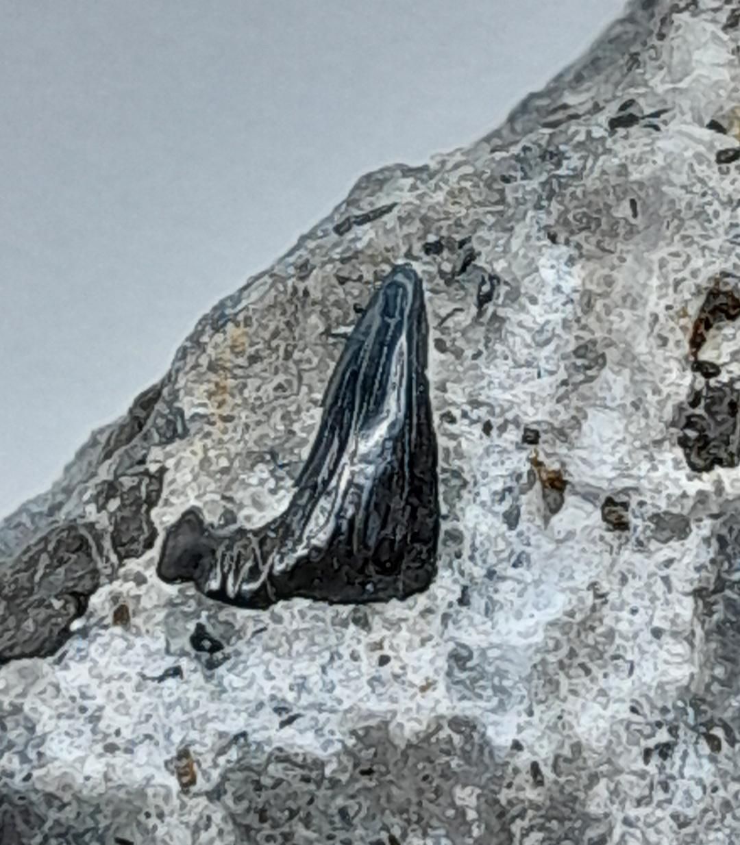 Rhomphaiodon minor. This rooted shark tooth measures 5 mm in height and is well presented on original matrix. It is Late Triassic age circa 210 million years old and comes from the Rhaetic Bone Bed, Westbury Formation, Penarth Group of Blue Anchor, Somerset, UK. Has full providence. Supplied labelled and in an attractive display box. Priced at £9. Quote reference number SUKM 4584.